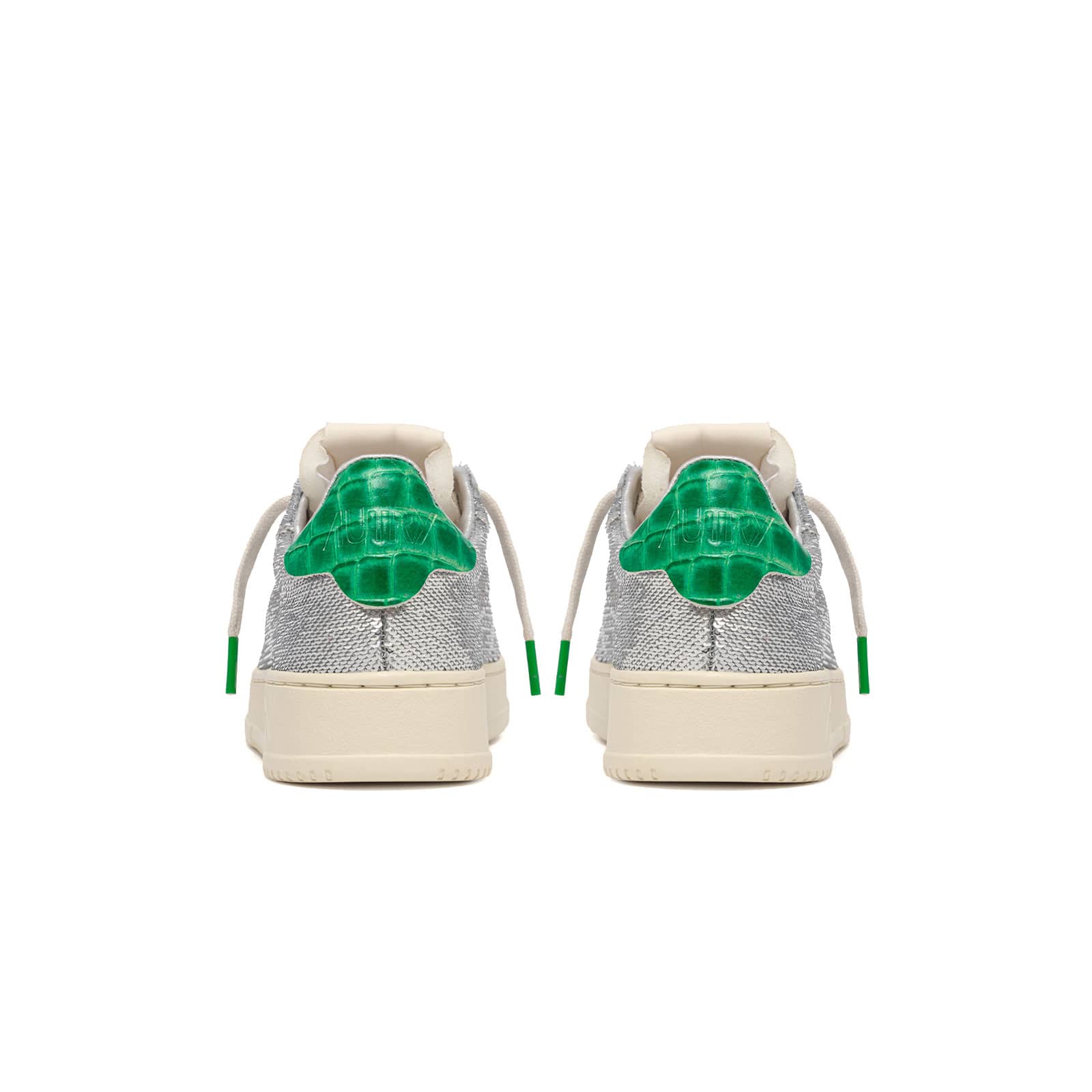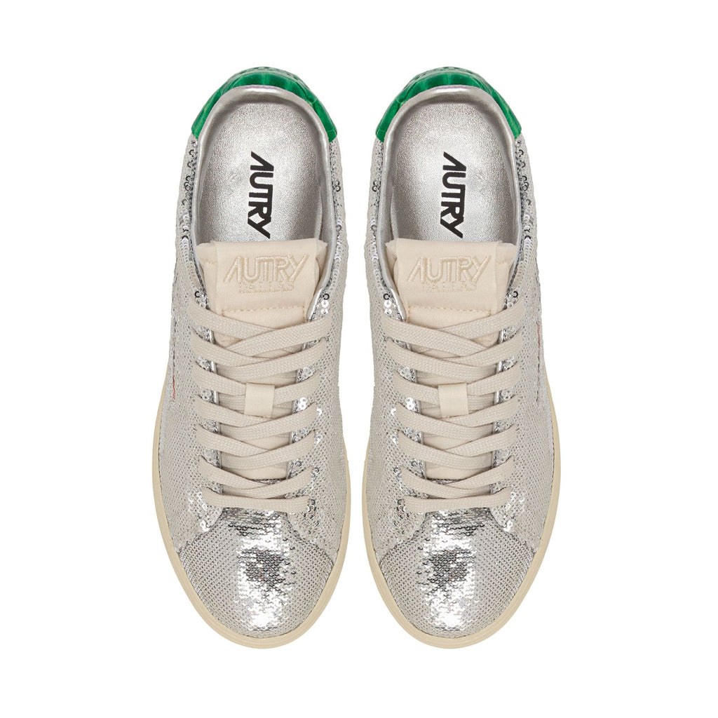Turn heads with the Autry Dallas Glitter Silver/Green, a statement sneaker entirely covered in sparkling silver glitter, finished with a bold green heel tab for a striking contrast. Blending retro tennis inspiration with glamorous style, this low-top design features premium leather details, cushioned lining, and a durable rubber sole for everyday comfort. The perfect mix of shine, sport, and sophistication.